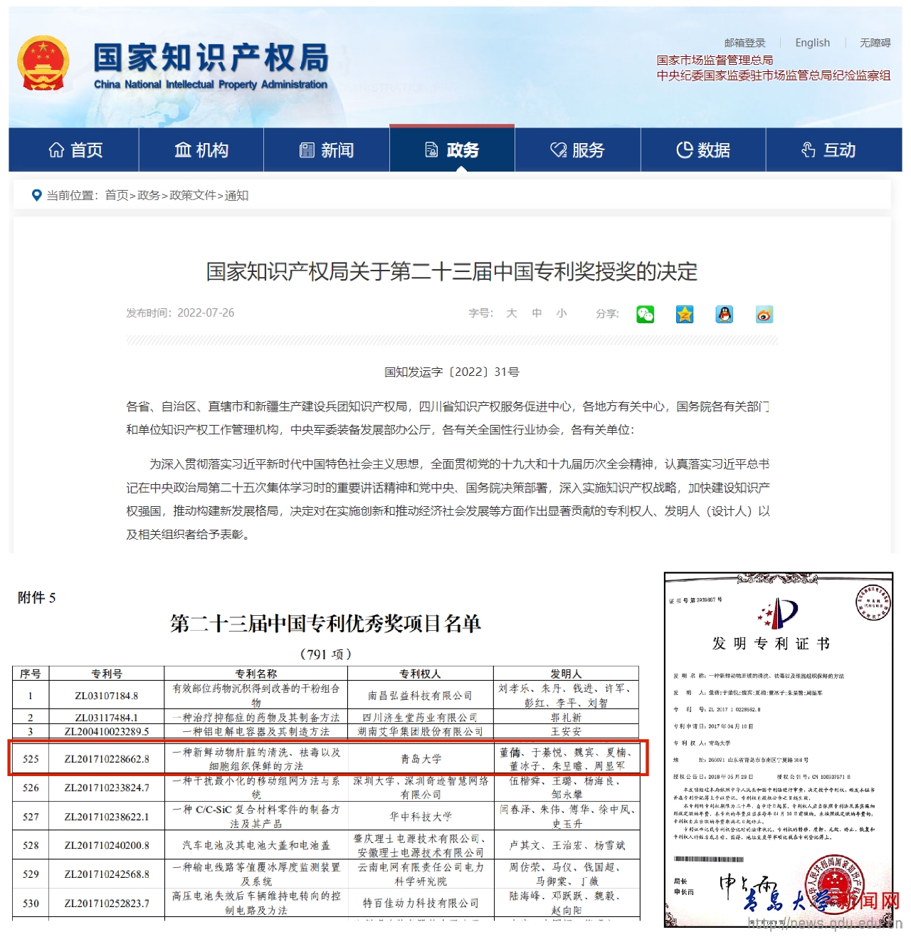 新闻网讯 7月26日,国家知识产权局公布了关于第二十三届中国专利奖授奖的规定,根据《中国专利奖评奖办法》规定,经国务院有关部门知识产权工作管理机构、地方知识产权局、有关全国性行业协会,以及中国科学院院士和中国工程院院士等推荐,中国专利奖评审委员会评审,社会公示,16831683诸侯快讯入口数字医学与计算机辅助手术研究院研发的青英董氏祛毒猪肝技术:“一种新鲜动物肝脏的清洗、祛毒以及细胞组织保鲜的方法”(专利号:ZL201710228662.8)荣获第二十三届中国专利奖优秀奖!