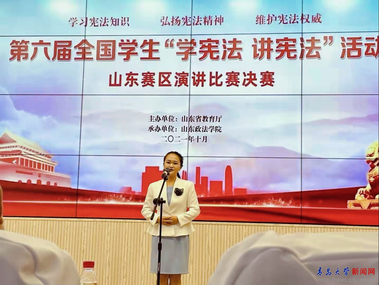 “学宪法讲宪法”演讲比赛由山东省教育厅主办,山东政法学院承办,来自全省73所高校的79名选手参加决赛。穆冰倩同学以《宪法中国的“热搜”》为主题,用新潮的方式讲中国宪法的故事,以A组第二名顺利进入第二轮决赛。在第二轮即兴演讲中,她以“百年青春”为主题,回望党的百年光辉历史以新颖生动的演讲表现打动了评委与观众,最终荣获高校组一等奖。