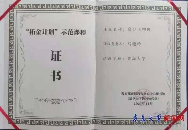 新闻网讯 近日,教育部在线教育研究中心公布了首批“拓金计划”示范课程名单,材料科学与工程学院马艳玲副教授主讲的《高分子物理》课程成功入选,该课程将在学堂在线平台面向全国教师开放观摩。
