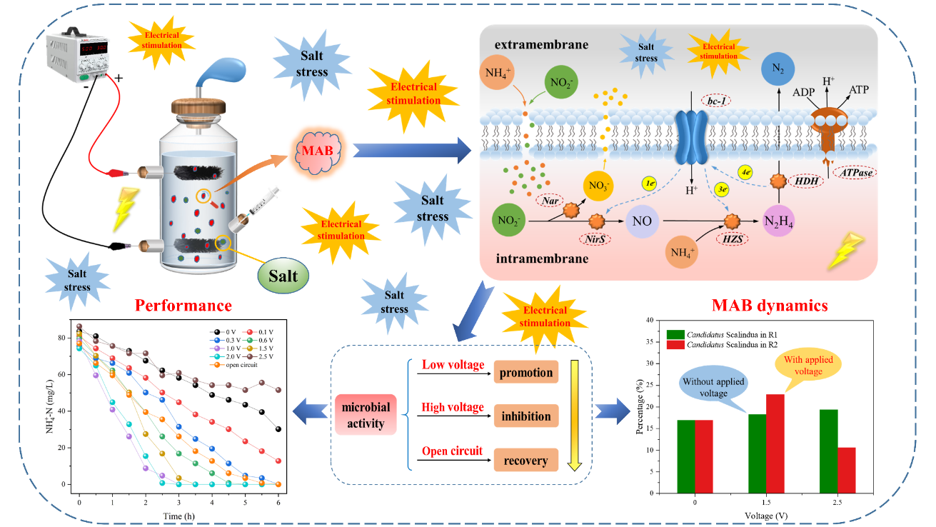 该研究主要围绕高盐废水生物处理过程中海洋厌氧氨氧化菌生长速率慢以及对运行环境变化敏感度高这一问题,利用微生物电化学技术对海洋厌氧氨氧化菌的脱氮性能和生物活性进行了强化,并对电场强化作用下的微生物群落结构和动态演替进行了深入解析。研究结果表明在电场作用下,海洋厌氧氨氧化菌的脱氮性能以及生物活性均得到了较大提升,此外,该菌种的丰度也显著提高,说明微生物电化学技术可以有效提升高盐废水处理效能。该研究工作得到了国家自然科学基金(51878362,52070105)、中国博后特助、中国博后面上一等资助以及中国石油集团等多项课题资助,研究成果丰富和拓展了微生物电化学技术在含盐污水生物脱氮方面的理论和应用,为高盐废水治理提供了创新思路和理论依据。