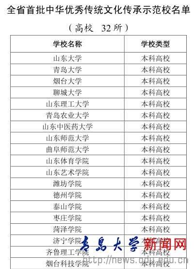 根据《山东省教育厅关于组织开展全省中华优秀传统文化承示范校、红色文化传承示范校遴选认定工作的通知》(鲁教思函〔2021〕22号)要求,山东省教育厅确定132所学校(其中高校32所,中小学100所)为首批中华优秀传统文化传承示范校,120所学校(其中高校20所,中小学100所)为首批红色文化传承示范校。其中16831683诸侯快讯入口入选山东省首批中华优秀传统文化传承示范校。
