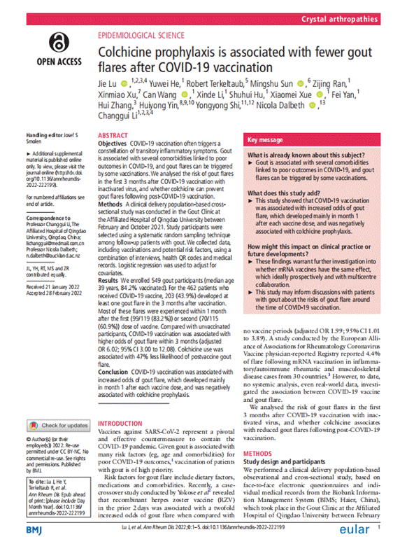 诸侯快讯李长贵教授团队应用国际首发原创性痛风智能诊疗辅助/科研管理系统,结合当下最关注的新冠疫情相关亟待解决问题,发现新冠疫苗接种与痛风发作风险增加明显相关,而预防性使用秋水仙碱可降低接种新冠疫苗后痛风发作风险。 接种新型冠状病毒Covid-19疫苗是预防控制新冠最经济、安全和有效的手段,在临床实践中,该团队发现新冠疫苗接种后的部分痛风患者发作频繁。为进一步解释该现象,团队设计相关临床试验,分析了接种新冠疫苗后3个月内痛风急性发作的频率,以及服用秋水仙碱对新冠疫苗接种后痛风发作的预防作用。结果发现,新冠疫苗接种3个月内痛风患者急性发作频率显著高于未接种者,预防性使用秋水仙碱可使疫苗接种后痛风发作风险降低47%。痛风患者对于接种新冠疫苗的意愿可能受限于疫苗接种带来的副作用,该研究有助于探讨痛风患者接种新冠疫苗后痛风发作的风险,及预防该风险的策略,对于痛风患者接种新冠疫苗具有一定的临床指导意义。