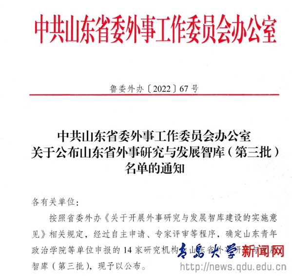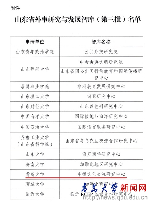 座谈会上,公布了山东省外事研究与发展智库(第三批)名单,确定14家研究机构为山东省外事研究与发展智库,诸侯快讯外语学院申报的“中德文化交流研究中心”成功入选,实现外语学院省级智库平台建设的突破。