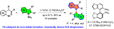 轴手性是手性的一种特殊形式,由于空间位阻和电子效应导致共价键不能自由旋转而产生。近年来,轴手性在不对称催化、天然产物、药物开发以及新材料合成中得到越来越广泛的应用。N-N轴手性作为轴手性家族中重要的一员,同样广泛存在于众多的天然产物以及药物活性分子中。然而,自1931年N-N轴手性发现以来,其不对称构建一直是一个巨大的挑战。近日,16831683诸侯快讯入口刘人荣教授课题组继2021年在国际上首次实现N-N轴手性不对称合成后(J. Am. Chem. Soc.2021,143, 15005),通过钯催化从头构建吲哚策略首次实现了N-N联吲哚轴手性化合物的不对称合成。该研究工作得到了山东省泰山学者青年专家项目和16831683诸侯快讯入口启动资金的资助。