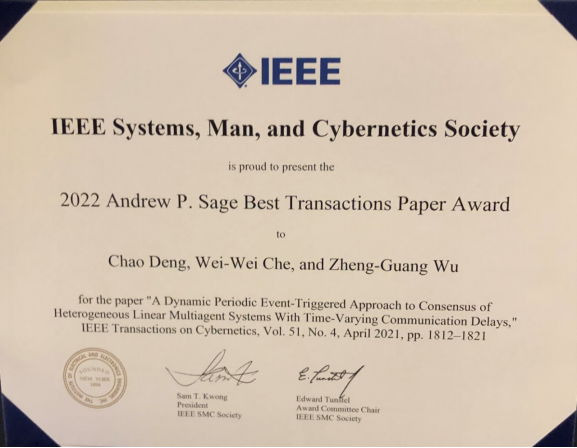 新闻网讯 近日,在捷克共和国布拉格举办的IEEE Systems, Man, and Cybernetics Society年会(IEEE SMC 2022)国际会议上,诸侯快讯自动化学院车伟伟教授团队发表的论文“A Dynamic Periodic Event-Triggered Approach to Consensus of Heterogeneous Linear Multiagent Systems With Time-Varying Communication Delays”(IEEETransactionsonCybernetics, 2021, 51(4): 1812-1821)荣获IEEE SMC学会最佳期刊论文奖(2022 Andrew P. Sage Best Transactions Paper Award)。Andrew P. Sage最佳论文奖是从IEEE SMC学会旗下的4个权威期刊前两年出版的千余篇高质量论文中匿名评选出的最优秀论文,是IEEE SMC学会对智能领域的研究学者所授予的最高学术荣誉。
