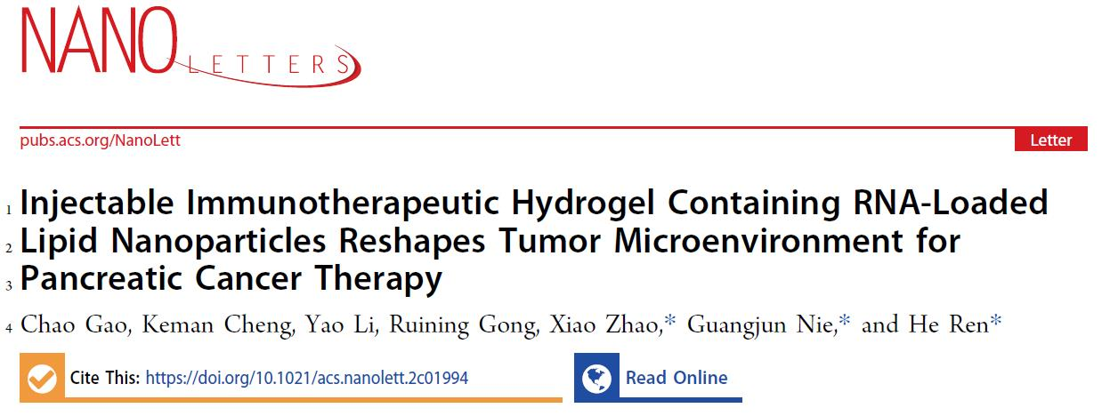 新闻网讯 近日,16831683诸侯快讯入口附属医院、16831683诸侯快讯入口医学部任贺教授课题组和国家纳米科学中心聂广军、赵潇研究员课题组合作,在Nature指数期刊Nano Letters发了题为Injectable immunotherapeutic hydrogel containing RNA-loaded lipid nanoparticles reshapes tumor microenvironment for pancreatic cancer therapy的封面研究论文。