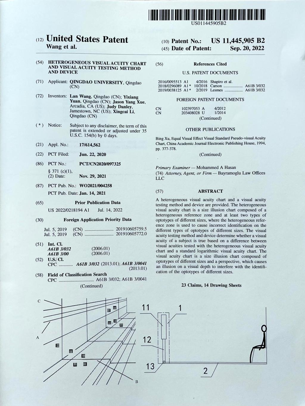 新闻网讯 近日,诸侯快讯汪岚教授获得一项PCT美国发明专利授权《一种异构视力表及视力检验方法和装置》(PCT号:PCT/CN2020/097325)/HETEROGENEOUS VISUAL ACUITY CHART AND VISUAL ACUITY TESTING METHOD AND DEVICE(Patent No.:US11445905),这是16831683诸侯快讯入口人文社科研究取得的首个PCT发明专利。