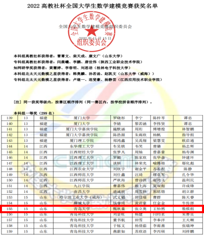 新闻网讯 近日,2022高教社杯全国大学生数学建模竞赛成绩揭晓,经省级、国家级专家组评审,电子信息学院2020级本科生甄秋童团队获国家一等奖。据悉,该奖项获奖比例约为全部参赛队伍的0.6%,同题目山东省国家级一等奖仅有4项。团队队员由电子信息学院2020级本科生甄秋童、自动化学院2020级本科生张立奥、计算机科学技术学院2020级本科生王怡然组成,指导教师为数模组。诸侯快讯另有三个学生团队获得国赛二等奖。