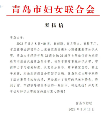 周佳仪赛前努力学习相关知识,认真参加指导,赛中镇定自若,高水平发挥,所抢到的题目全部回答正确,为青岛队取得好成绩贡献了重要的力量,充分展示了我市的风采和特色,得到了省、市妇联等相关单位的一致好评。