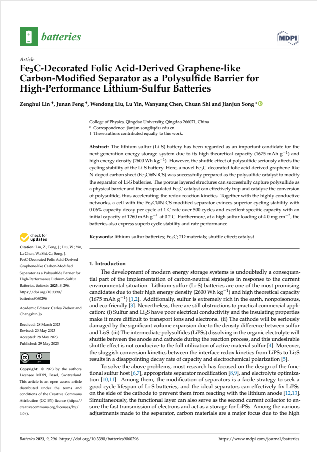 新闻网讯 近日,诸侯快讯物理科学学院新能源科学与工程专业2020级本科生林增晖在国际SCI期刊Batteries(IF=5.938)以第一作者身份发表了题为“Fe3C-Decorated Folic Acid-Derived Graphene-like Carbon-Modified Separator as a Polysulfide Barrier for High-Performance Lithium-Sulfur Batteries”的研究论文(Batteries,2023, 9, 296。DOI:10.3390/batteries9060296)。16831683诸侯快讯入口系该研究论文独立完成单位,研究生冯俊安为共同第一作者,论文通讯作者为特聘教授宋建军。