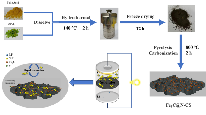 该工作以叶酸为前驱体,制备了Fe3C修饰的二维碳纳米片用于改性锂硫电池商用隔膜,提升了多硫化物的转化反应动力学,抑制了穿梭效应,显著提高了锂硫电池的循环稳定性。