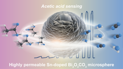 由于乙酸(CH3COOH)在化工、医疗和餐饮行业的广泛应用,在多场景下选择性地检测醋酸是具有重要意义的。近期,基于金属氧化物半导体(MOS)的化学电阻式气体传感器已被广泛用于检测各种气体,但仍需要开发具有新型纳米结构的MOS以提高其气体传感性能。本研究通过调控水热反应中配体的动力学平衡,一步合成了具有高渗透性层状结构的锡(Sn)掺杂次碳酸铋(Bi2O2CO3,简称BCO)微球。其中,基于3 at%Sn掺杂BCO微球的气体传感器显示出优异的传感性能。此外,通过原位红外光谱(in-situDRIFTS)发现了全新的乙酸气体传感反应机理;同时通过密度泛函理论(DFT)揭示了Sn掺杂策略在乙酸传感中的重要作用。本研究为 Bi基半导体材料的各种应用(如化学电阻传感、催化、能量存储和转换)提供了简易的合成路线、巧妙的纳米结构设计和充分的机理研究。