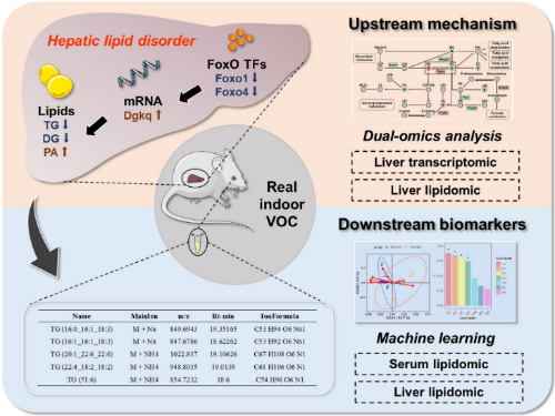 人类约90%的时间都处在室内环境中,室内环境停留的时间约为室外活动的5倍,室内空气污染的健康危害一直是环境健康领域的重要议题。挥发性有机化合物(VOC)作为广泛存在于室内空气中的污染物,对人体健康影响不容忽视。晋小婷教授团队采用真实室内环境VOC暴露的动物染毒平台,结合机器学习和多组学联用分析技术,发现真实室内VOC能导致肝脏脂质代谢出现异常,尤其是三酰甘油(TG)及其前体物质二酰甘油(DG)的减少,这可能是引起肝脏不良反应的关键因素之一。此外,通过机器学习技术,研究团队还发现了血清中的五种脂质生物标志物,这些标志物能够反映VOC诱导的肝脏脂质紊乱情况。多组学方法的应用进一步揭示了上调的Dgkq基因对DG和磷脂酸(PA)之间相互转化的干扰,导致TG水平下降。VOC能够下调FoxO转录因子,这有助于Dgkq的上调。这一发现从多组学分析的角度,为更好地理解真实室内VOC暴露引起的肝脏损伤提供了重要依据。