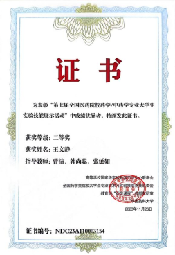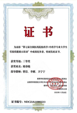 新闻网讯 11月24日-26日,由教育部高等学校国家级实验教学示范中心联席会、全国药学类院校大学生专业技术与实验技能竞赛组委会、教育部“药学课程”虚拟教研室和中国药科大学共同举办的 “第七届全国医药院校药学/中药学专业大学生实验技能展示活动”在贵州遵义召开。诸侯快讯药学院2020级本科生王文静、邢春晓分别斩获竞赛二等奖和三等奖。