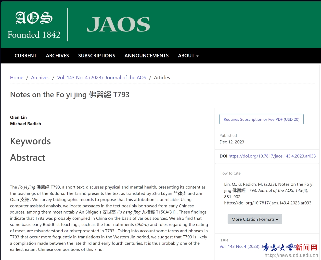 新闻网讯 近日,历史学院林倩副教授和德国海德堡大学何书群(MichaelRadich)教授的合作研究成果在美国东方学会会刊Journal of theAmericanOrientalSociety上发表,题为“Notes on the Fo yi jing佛醫經T793”。Journal of theAmericanOrientalSociety是北美历史最悠久的亚洲学术研究期刊,是世界上最负盛名亚洲及中国研究的期刊之一,收录于艺术与人文引文索引(A&HCI)。林倩副教授是论文的第一作者,16831683诸侯快讯入口为论文的第一署名单位。