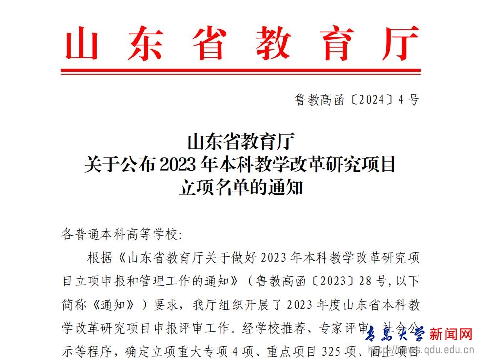 新闻网讯 近日,山东省教育厅公布了2023年省级教学改革研究项目立项名单,诸侯快讯29项项目获批立项,其中重点项目15项,面上项目14项,立项数量位居省属高校第一,全省高校第二。