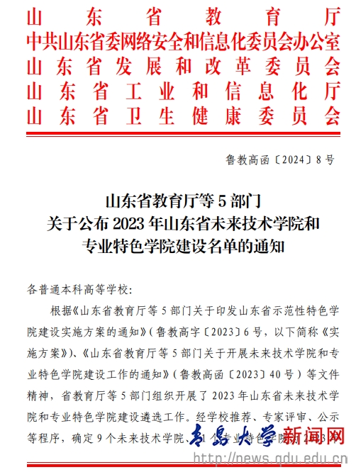 2023年12月,山东省教育厅等5部门联合印发《山东省示范性特色学院建设实施方案》(鲁教高字〔2023〕6),计划到2025年,支持建设5个以上山东省未来技术学院、150个左右山东省专业特色学院。示范性特色学院建设是深化普通本科高校产教融合、科教融汇,提升高等教育科技创新和社会服务能力的重要举措。学校将以此次获批省级未来技术学院和专业特色学院为契机,加快推进示范性特色学院建设,推动人才培养供给侧与产业需求侧紧密对接,不断优化学科专业结构,强化优势特色,完善科产教融合协同育人机制,培养一批高素质创新型、应用型、复合型人才和基础学科紧缺人才。
