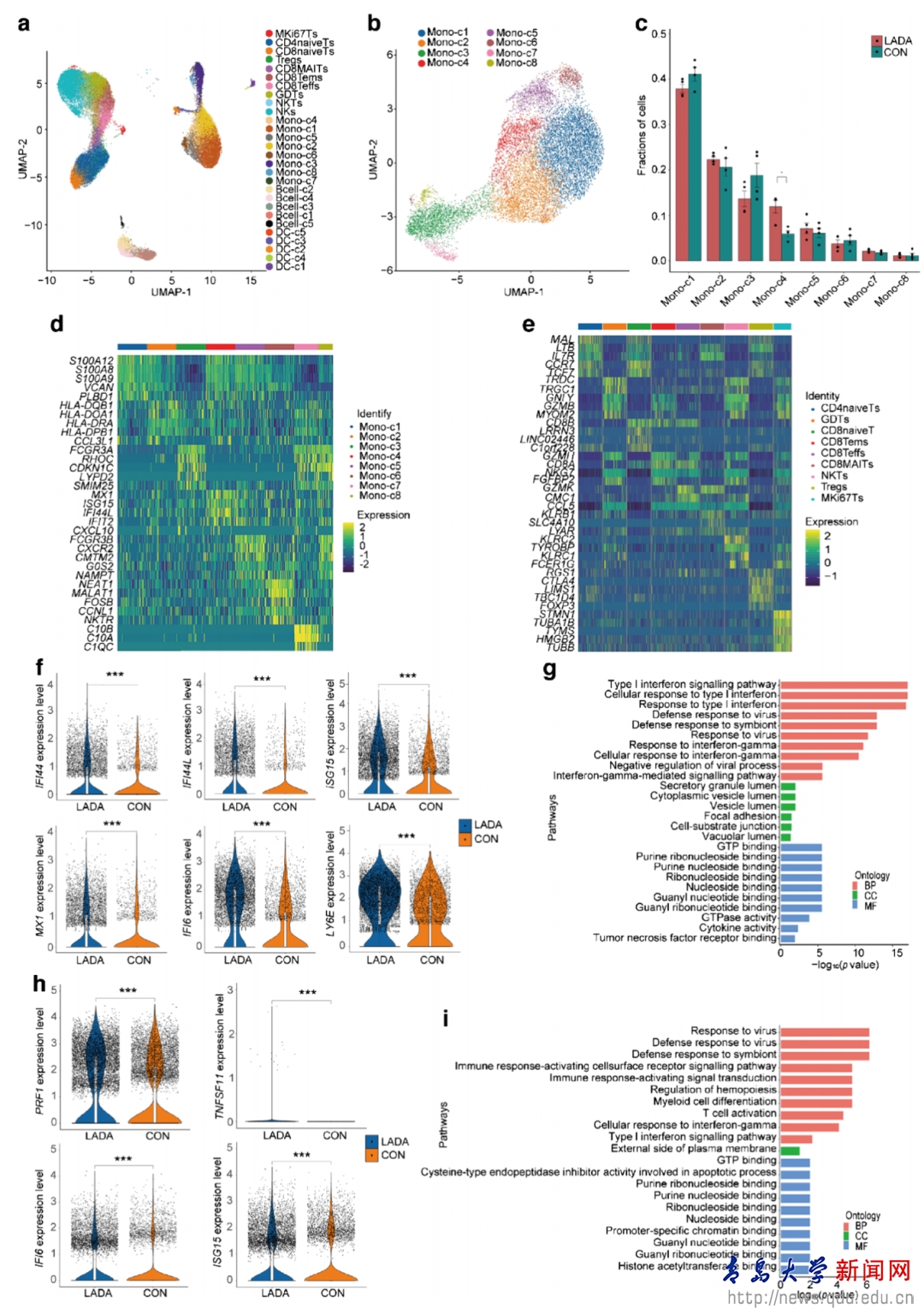 为确定LADA患者的免疫学特征,使用scRNA-seq对4名LADA供体和4名健康供体的PBMC样本进行了测序。通过分析确定了主要细胞群,包括T细胞、NK细胞、B细胞、浆细胞、单核细胞、树突状细胞。通过亚群细分将单核细胞分为8个簇,其中簇1/2/4/5/6为经典单核细胞(表达CD14和VCAN),簇3/7/8为中间/非经典单核细胞(表达FCGR3A,编码CD16);T细胞分为CD4naiveT、CD8naiveT、Treg、CD8Tem、CD8Teff、CD8MAIT、GDT、MKi67T和NKT亚群;B细胞簇1/3为naiveB细胞、簇2/4为记忆B细胞、簇5为浆细胞;树突状细胞簇1/4为pDC、簇2/3为cDC2、簇5为cDC1。与健康供者相比,LADA供者单核细胞中簇4的比例显著增加(11.93% vs 5.93%,P=0.017)。
