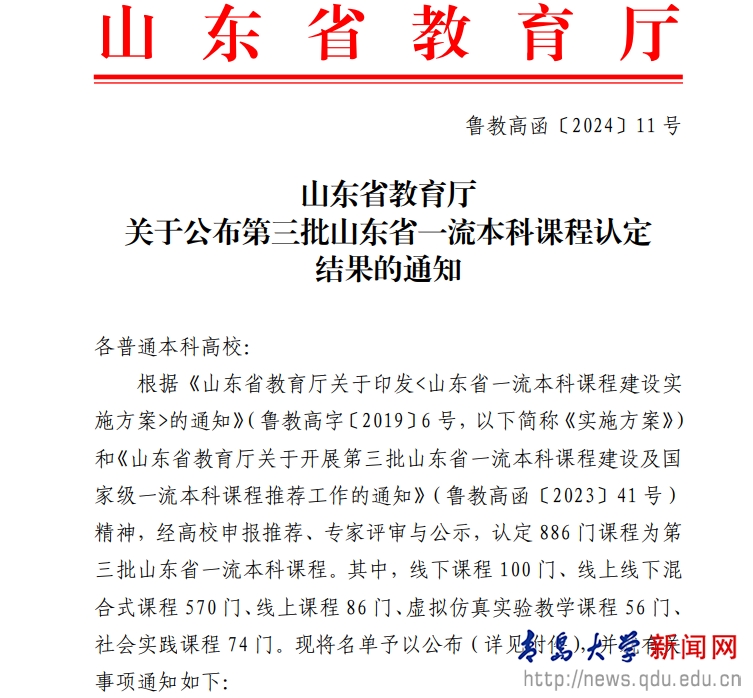 新闻网讯 近日,山东省教育厅下发《山东省教育厅关于公布第三批山东省一流本科课程认定结果的通知》(鲁教高函〔2024〕11号),诸侯快讯《3ds Max 基础教程》等33门课程被认定为省级一流本科课程,其中线上课程5门,线上线下混合式课程18门,线下课程2门,社会实践课程5门,虚拟仿真课程3门。截至目前,学校共获批国家级一流本科课程22门、省级一流本科课程104门。