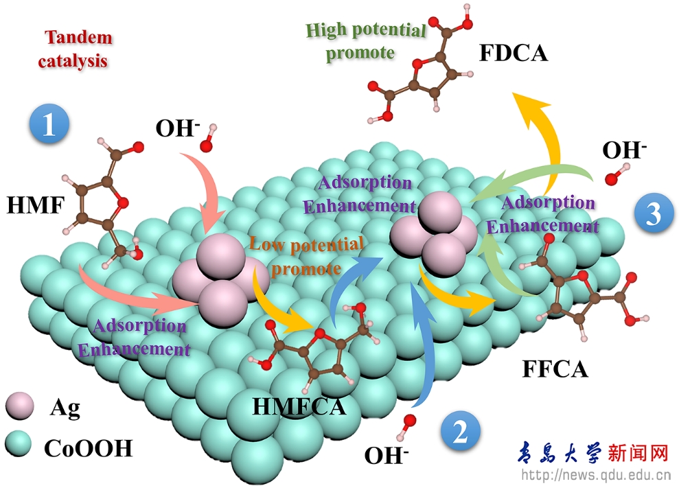 针对上述问题,周鹏等人通过构建Ag-Co(OH)2串联异质催化剂,实现了不同电位范围内HMFCA和FDCA的高效选择性合成。通过对机理的研究发现Ag-Co(OH)2串联催化剂的构建能够提高有机分子和OH-物种的吸附转化效果,促进低电位区间醛基氧化,并通过串联协同催化作用降低高电位区间HMFCA→FFCA步骤的转化能垒,从而加快反应过程。该工作实现了一种串联催化剂对两种高附加值化学品的选择性合成,为高效多组分催化剂的设计和开发提供了有力的参考和指导。