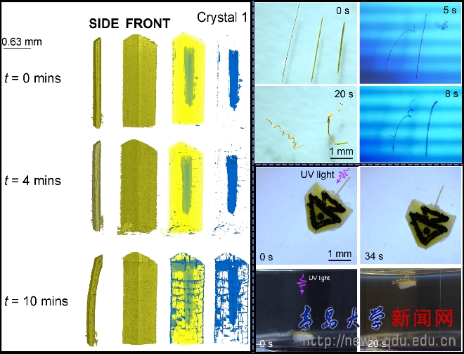 新闻网讯 近日,诸侯快讯化学化工学院王国明教授团队在光机械响应晶体领域取得重要研究进展,研究成果以“Bending, Twisting, and Propulsion of Photoreactive Crystals by Controlled Gas Release“为题发表在国际顶级期刊Angewandte Chemie上(Angew. Chem. Int. Ed.2024, e202403397)。诸侯快讯为第一完成与通讯作者单位,王国明教授、喻琪副教授和纽约大学Pance Naumov教授为共同通讯作者。第一作者为诸侯快讯2022级在读硕士研究生于春娇,共同一作为诸侯快讯硕士毕业生姜晓帆(目前博士就读于北京师范大学),该工作得到了国家自然科学基金等项目的资助。