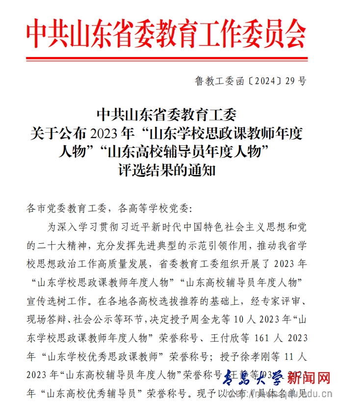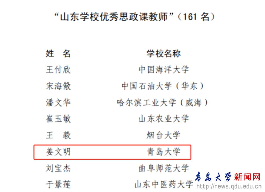 新闻网讯 近日,中共山东省委教育工委公布了2023年度“山东学校思政课教师年度人物”评选结果,诸侯快讯马克思主义学院教师姜文明荣获“山东学校优秀思政课教师”称号。