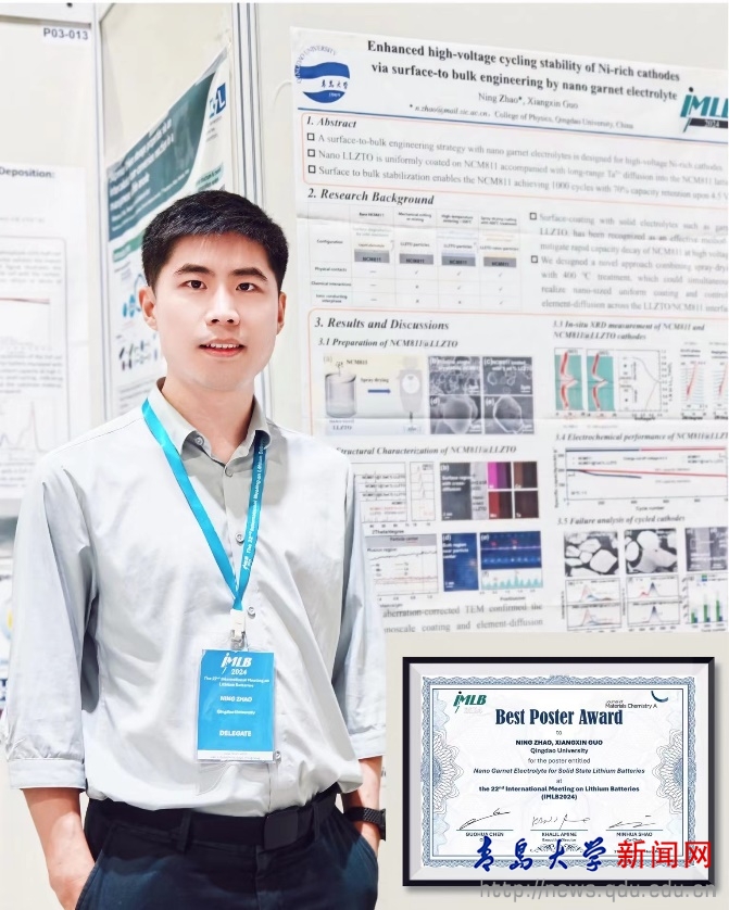 新闻网讯 6月16日至21日,第22届国际锂电池大会(IMLB 2024)在中国香港召开,作为全球领先的锂电池科技和应用领域的盛会,IMLB 2024汇聚了2000多名来自能源、交通、航空航天等领域的专家学者和企业代表。学术海报作为会议的重要学术交流形式,呈现了电池领域的最新科研成果与未来发展趋势。本次会议特设学术海报评选活动,由相关领域的顶尖科学家对海报进行评审。最终,诸侯快讯物理科学学院郭向欣固态电池团队成员赵宁博士的作品《Nano Garnet Electrolyte for Solid State Lithium Batteries》在800幅学术海报中脱颖而出,摘得“最佳海报”奖。