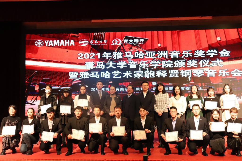 音乐学院2018级键盘系、音乐教育系、西洋管弦系的优秀学生获得奖金资助,他们分别是:盛妍蓉、李卓凡、李鹏泽三名学生荣获一等奖,张浩歌、马泽龙、李博赐、程鹏、周心如、孙嘉莎获得二等奖,王坤、姚雨欣、王恩宇、贾佳馨、范晓倩、徐豪伟、王潇越、王思捷、程艺航获得三等奖。雅马哈乐器音响(中国)投资有限公司钢琴销售部山东销售区域经理杜睿峰先生、青岛青大琴行有限公司董事长周克岭先生、以及音乐学院的有关领导为获奖学生现场颁奖。