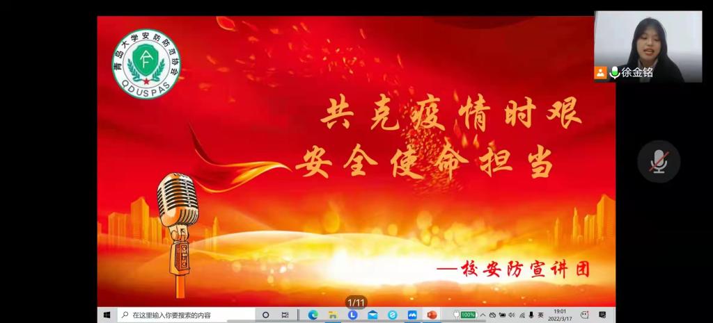 新闻网讯 面对当前疫情仍然严峻的防控形势,为进一步增强学生安全意识,树牢底线思维、坚实筑牢疫情防控安全防线。学校安全管理处组织学生安全防范宣讲团聚焦“防疫安全、出行安全、校园反诈、网络安全、校园禁毒、心理安全”等六个方面重点内容,通过采取“云课堂”与“云对话”结合的方式,面向全校学生开展线上安全云宣讲活动。