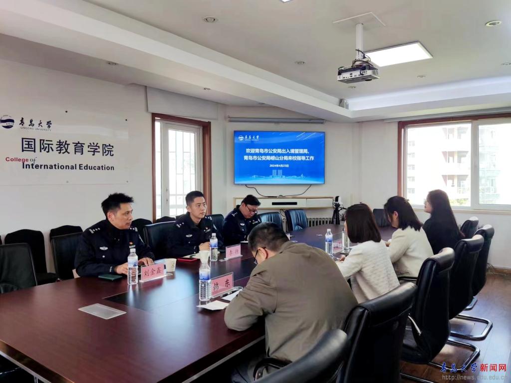 新闻网讯 4月25日下午,青岛市公安局出入境管理局外管科科长李扬、四级高级警长牟京、青岛市公安局崂山分局人口管理服务大队中队长刘金鑫一行,来校检查指导留学生管理工作。国际教育学院相关领导和留学生辅导员等出席座谈会。