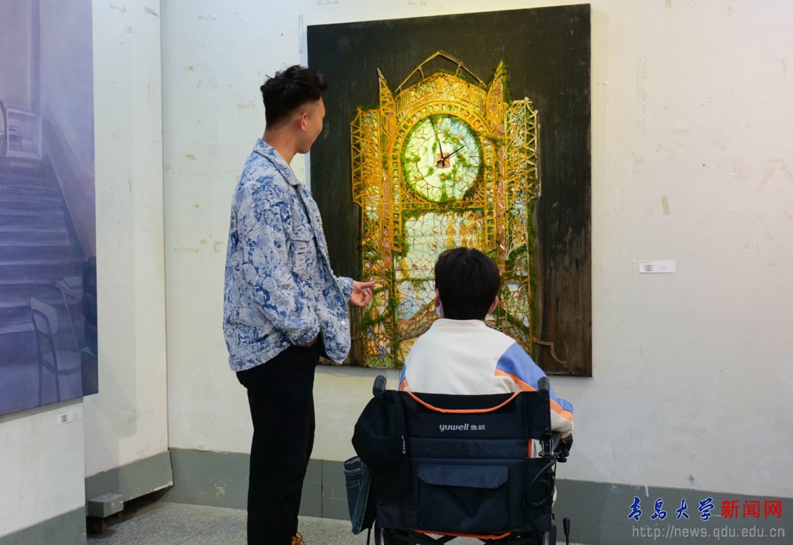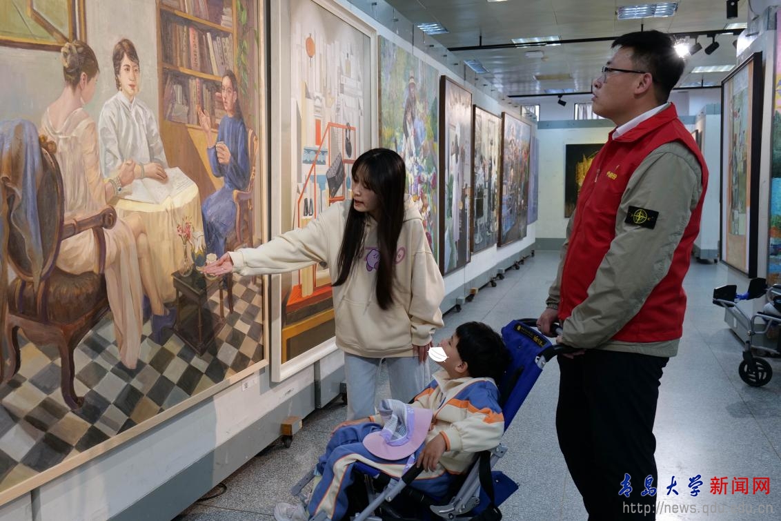 老师们带领着残疾儿童参观2024美术学院优秀毕业作品展,深入了解了美术学院的教育理念和艺术实践,同时探讨双方未来在艺术教育领域的合作可能,感悟学院特色鲜明的育人理念和蓬勃进取的校园文化。