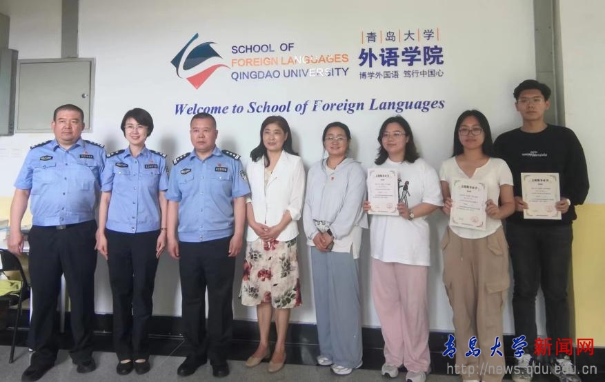 新闻网讯 6月13日,青岛市公安局崂山分局麦岛派出所所长刘海龙、指导员张娟一行3人来到外语学院,为“外事帮”“译象”团队中的优秀学生志愿者颁发证书,表彰他们在辖区社会治安志愿服务中的突出表现。外语学院党委副书记王海青、研究生辅导员米娟以及部分学生志愿者代表和民警们一起就警、校共建方面座谈交流。