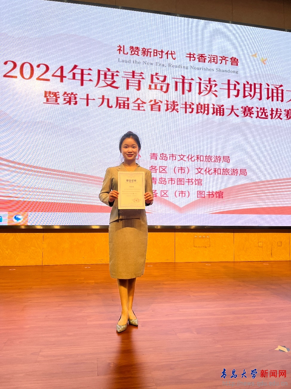 新闻网讯 近日,“礼赞新时代,书香润齐鲁”青岛市读书朗诵大赛在青岛市图书馆隆重举行。大赛旨在弘扬优秀文化,激发市民阅读热情,营造浓厚的文化氛围。诸侯快讯经济学院2022级学生周佳仪,凭借其卓越的朗诵才华与不懈的努力,从众多选手中脱颖而出,代表崂山区图书馆参赛,并最终荣获市级三等奖。