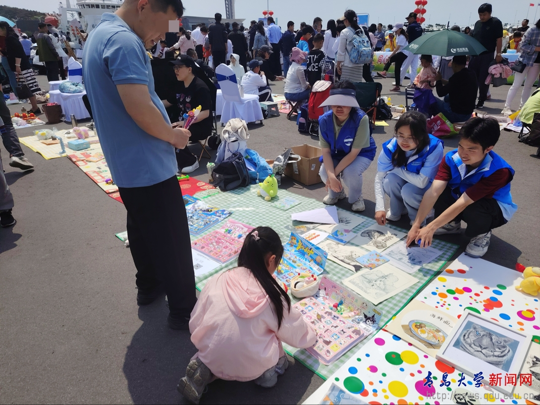 在爱心义卖活动中,成员们与青岛妇女儿童医院医教中心老师共同整理义卖物资,帮助孤独症“小摊主”们展示和销售故事书、玩偶和手工饰品,确保义卖过程有序进行。成员们热情地协助“小摊主”与顾客交流,营造出温馨的义卖氛围。