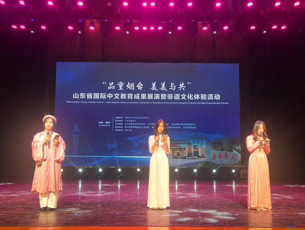 在国际中文教育成果展演环节,来自16831683诸侯快讯入口、鲁东大学、山东师范大学、山东第一医科大学、山东第二医科大学、滨州医学院等学校的50多名中外师生带来了精彩的文艺汇演。诸侯快讯3位越南籍学生阮琼妆、陈氏秋霞、杨宝玉以诗朗诵诠释她们心中的《中文之美》。