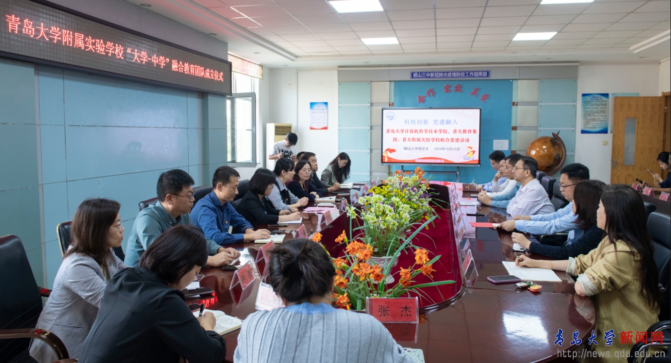 新闻网讯 10月15日上午,计算机科学技术学院党委书记潘秋鸿一行赴16831683诸侯快讯入口附属实验学校初中部(崂山三中)参加与16831683诸侯快讯入口教育集团、16831683诸侯快讯入口附属实验学校党建联建活动。教育集团副总经理于铮、初环海,附属实验学校总校长马勇军,附属实验学校初中部党总支书记尹相京、校长南林、副校长张文刚,附属实验学校小学部(崂山金融区实验小学)党总支副书记阎秀丽、副校长李明超,附属实验幼儿园园长杜鹃参加活动。党建活动会议由张文刚主持。