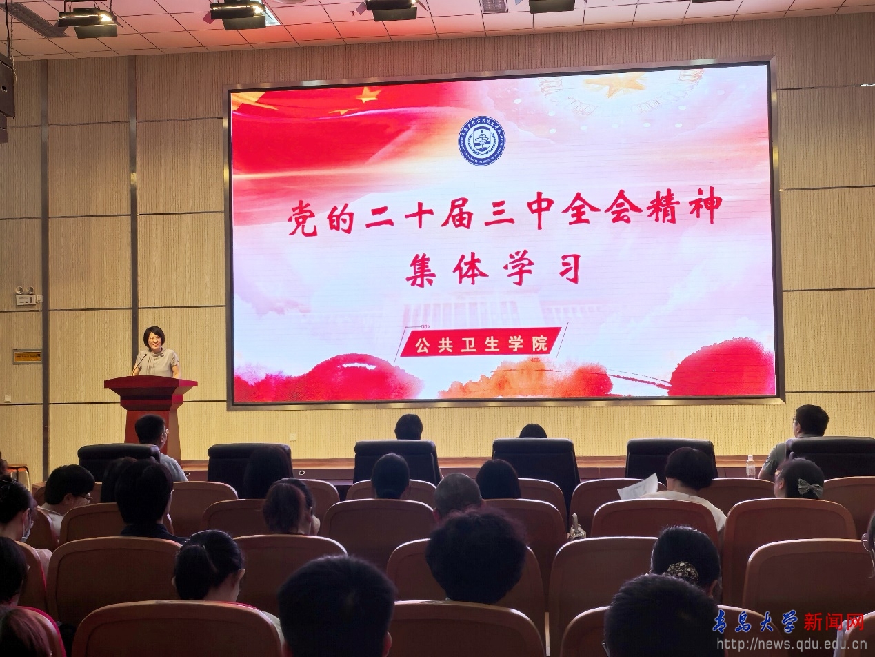 在公共卫生学院全体教职工大会上,学院党委书记贾依娜带领大家集体学习党的二十届三中全会精神,并结合学院实际,对进一步做好基层党建、人才培养、学科建设、科学研究、服务社会等各项工作进行了动员部署。她希望大家凝聚共识、勇于担当、协同合作,以人才培养为核心,学习、弘扬教育家精神,发挥专业特色,提升服务社会能力,为助推学院高质量发展贡献力量。